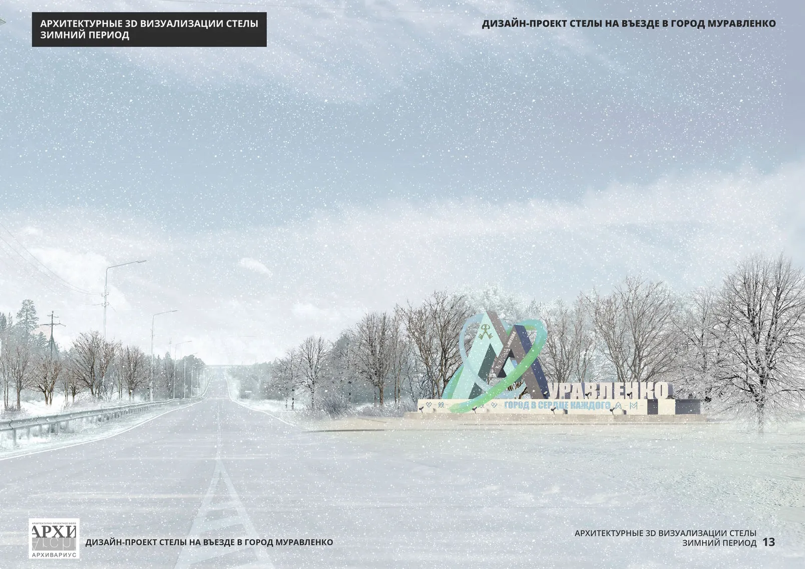 Дизайн-проект стелы на въезде в город Муравленко Ямало-Ненецкого автономного округа был выполнен в 2021 г. Полный альбом