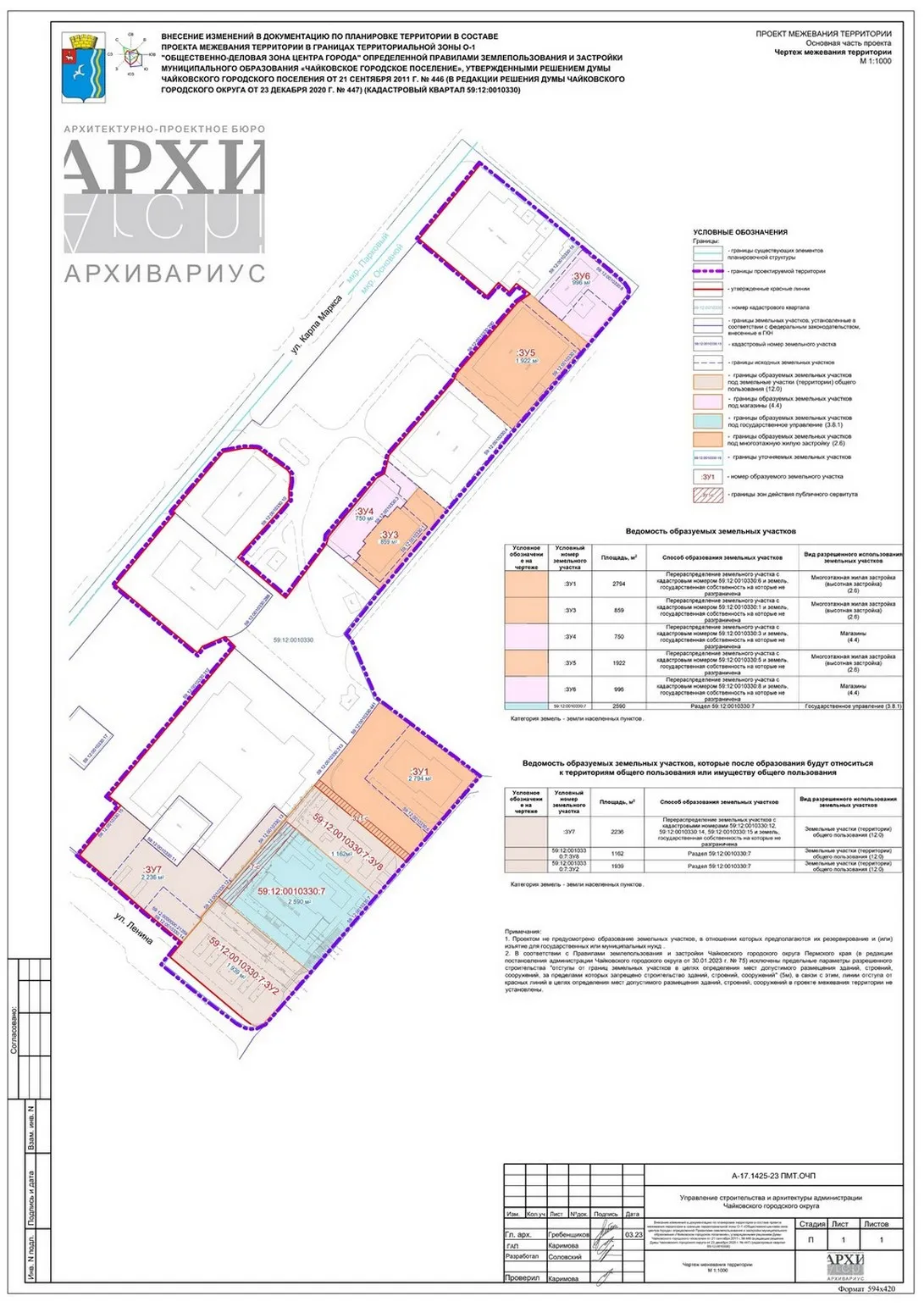 Внесение изменений в документацию по планировке территории в составе проекта межевания территории в границах территориальной зоны О-1 "Общественно-деловая зона центра города" определенной правилами землепользования и застройки муниципального образования "Чайковское городское поселение", утвержденными решением думы Чайковского городского поселения от 21 сентября 2011 г. № 446 (в редакции решения думы Чайковского городского округа от 23 декабря 2020 г. № 447) (Кадастровый квартал 59:12:0010330) Пермского края было выполнено в 2023 г. В составе работ выполнялись инженерно-геодезические изыскания.