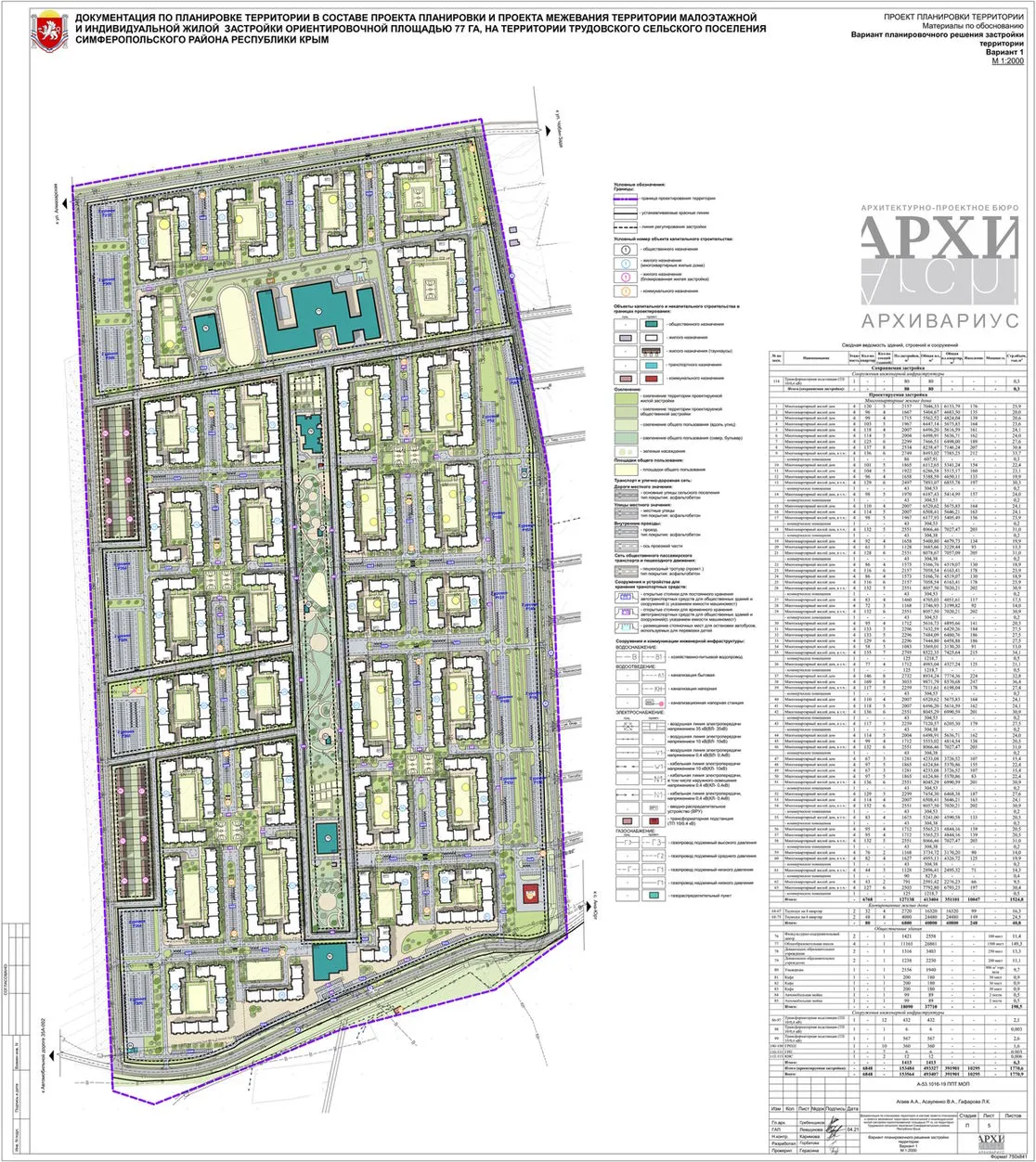- Документация по планировке территории в составе проекта планировки и проекта межевания территории малоэтажной и индивидуальной жилой застройки ориентировочной площадью 77 Га, на территории Трудовского сельского поселения Симферопольского района.