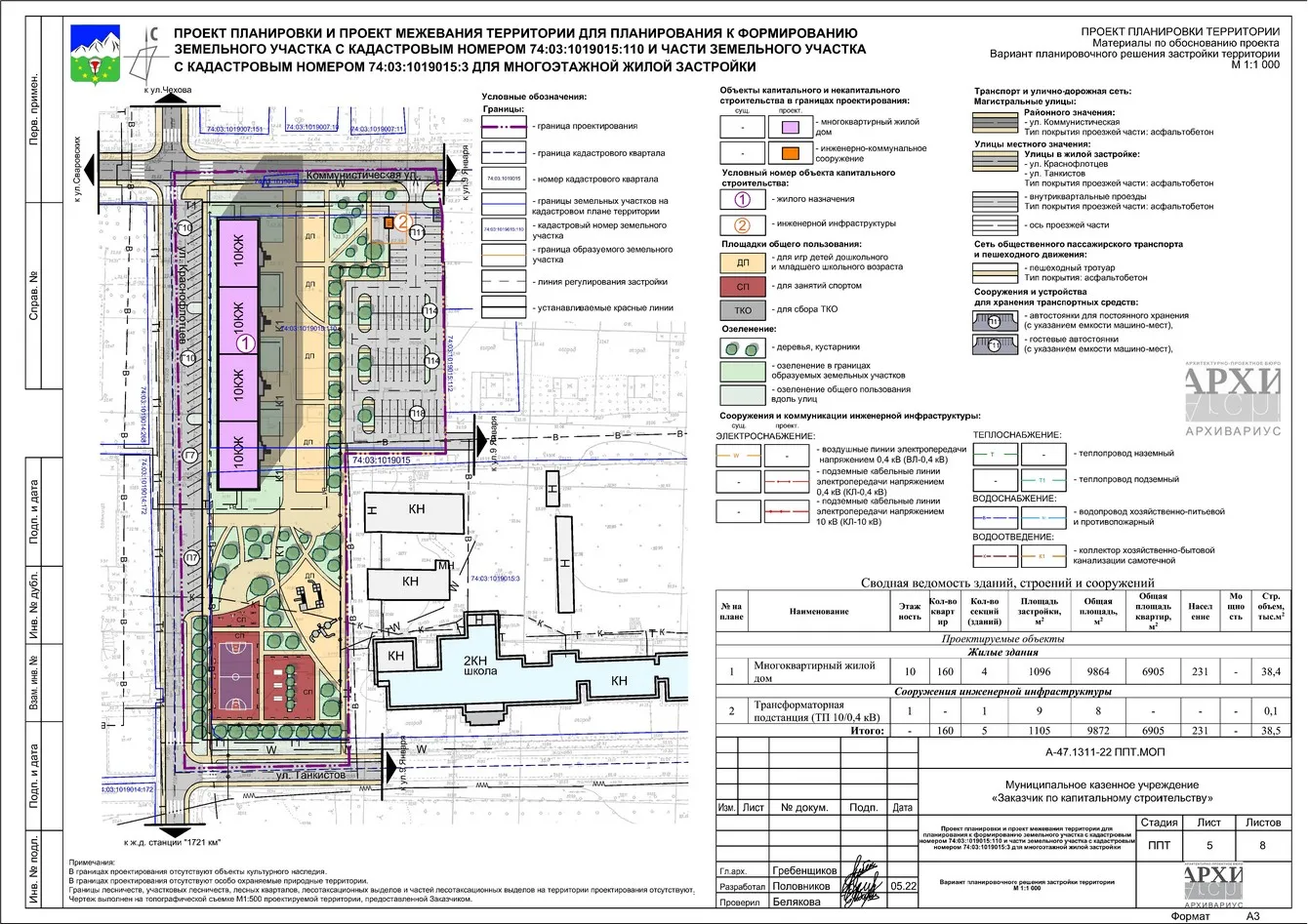 Проект планировки и проект межевания территории для планирования к формированию земельного участка с кадастровым номером 74:03:1019015:110 и части земельного участка с кадастровым номером 74:03:1019015:3 для многоэтажной жилой застройки города Аша Челябинской области были выполнены в 2022 г.