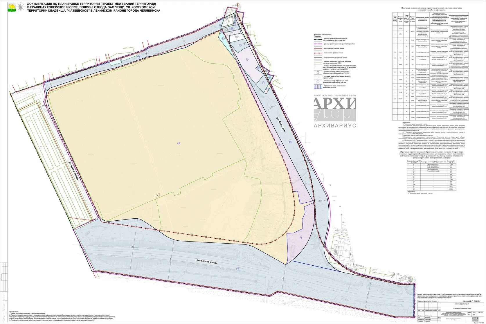 - Документация по планировке территории (проект межевания территории) в границах Копейское шоссе, полосы отвода ОАО "РЖД", ул. Костромской, территории кладбища "Фатеевское" в Ленинском районе города Челябинска Челябинской области.