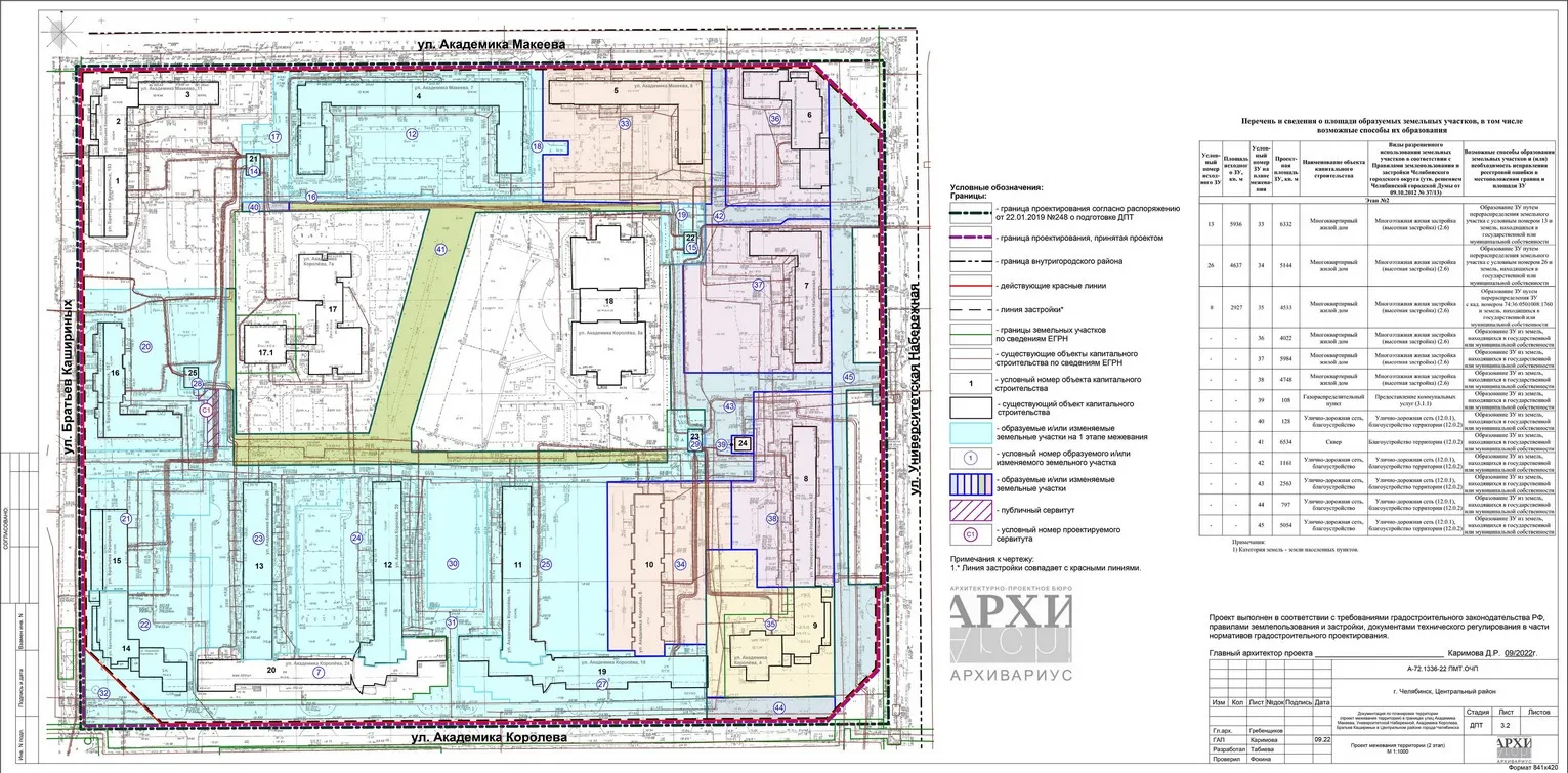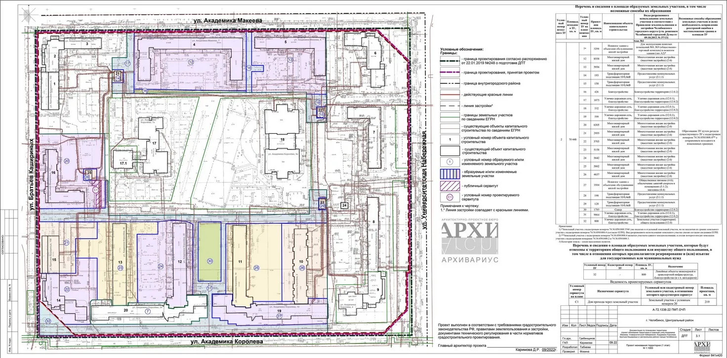 - Документация по планировке территории (проект межевания территории) в границах улиц Академика Макеева, Университетской Набережной, Академика Королева, Братьев Кашириных в Центральном районе города Челябинска Челябинской области.