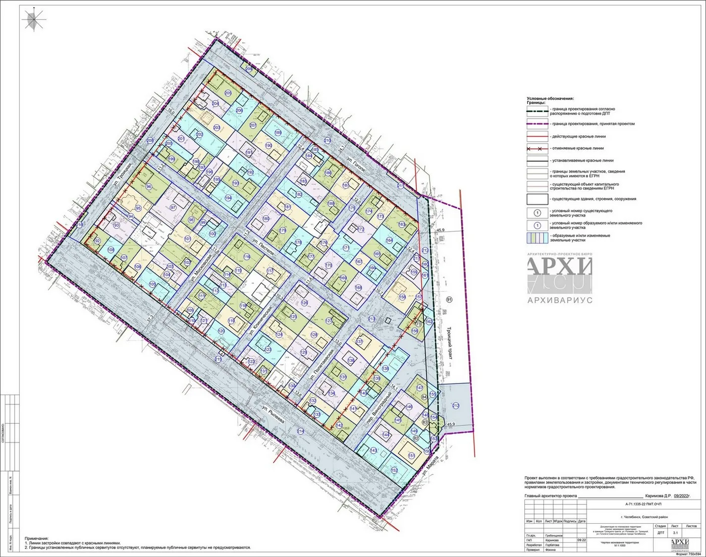 - Документация по планировке территории (проект межевания территории) в границах Троицкого тракта, ул. Рылеева, ул. Троицкой, ул. Гоголя в Советском районе города Челябинска Челябинской области.