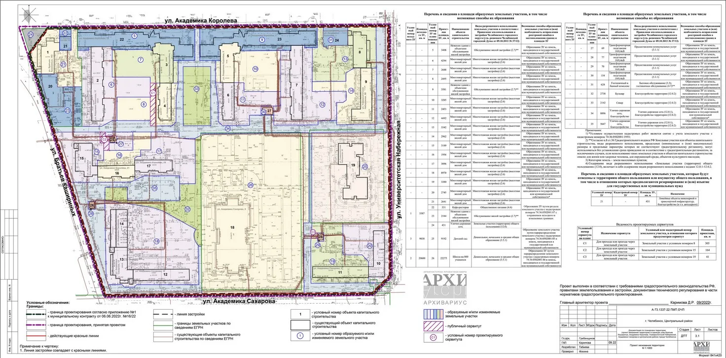 - Документация по планировке территории (проект межевания территории) в границах улиц Братьев Кашириных, Академика Королева, Университетской Набережной, Академика Сахарова в Центральном районе города Челябинска Челябинской области.