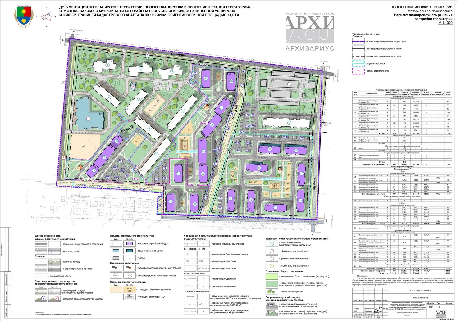 Документация по планировке территории (проект планировки и проект межевания территории) с. Уютное Сакского муниципального района Республики Крым, ограниченной ул. Кирова и южной границей кадастрового квартала 90:11:220102, ориентировочной площадью 14,0 га была выполнена в 2023 г.