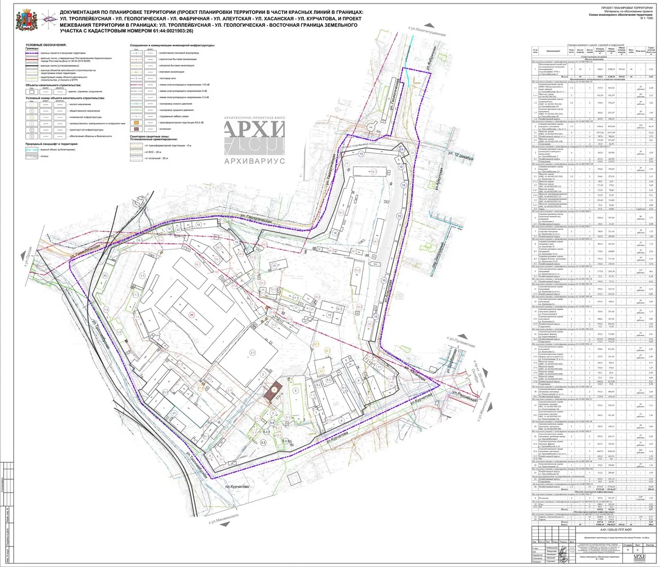 Документация по планировке территории (проект планировки территории в части красных линий в границах: ул. Троллейбусная - ул. Геологическая - ул. Фабричная - ул. Алеутская - ул. Хасанская - ул. Курчатова, и проект межевания территории в границах: ул. Троллейбусная - ул. Геологическая - Восточная граница земельного участка с кадастровым номером 61:44:0021903:26) г. Ростов-на-Дону Ростовской области была выполнена в 2022 г.